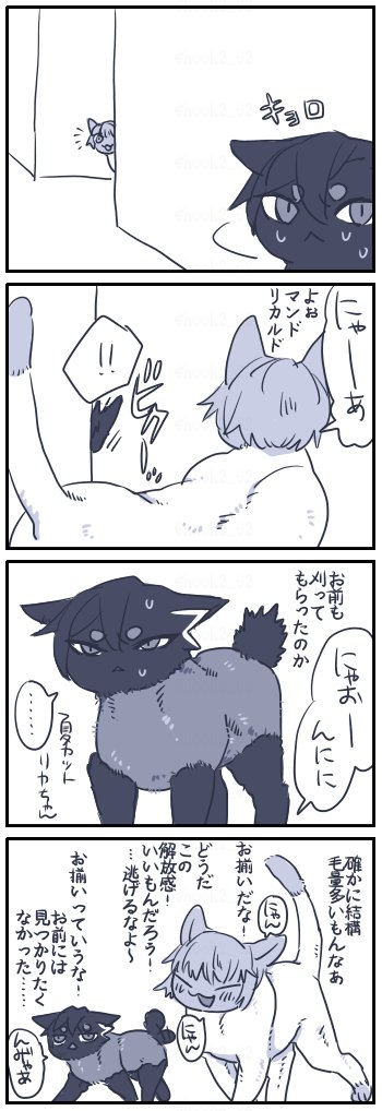 お題箱より ネコチャン漫画 > ローにゃんとパーにゃんが喧嘩みたいな声と物音立ててるからびっくりして見に行ったら単純にじゃれあっててテンションが上がりす… #odaibako_hook2_62 odaibako.net/detail/request… 底が抜けるかと思うようなすごい音しそうですねでっかいネコチャンかわいいかわいい