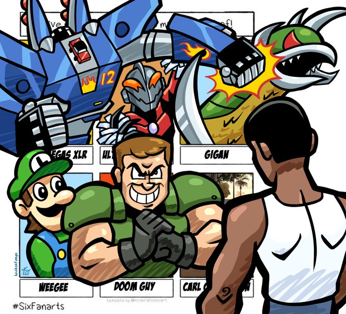 Here's my #SixFanarts We got Megas, Ultraman Belial, Gigan, Weegee, Doom Guy, and Carl "CJ" Johnson! Thanks for the suggestions: @DoughBoyArt @DataByteReviews @ShiningTatsu64 @Tequila_Koops @SirNicholas19 @PrinxeDevitt @runner3166