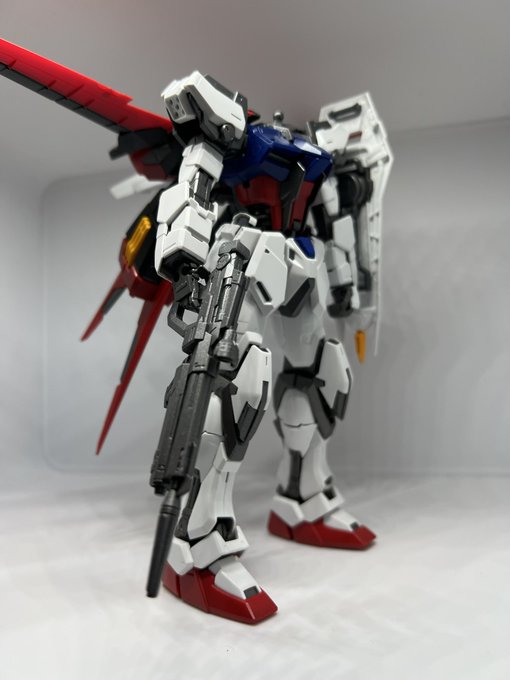 1/100 MG エールストライクガンダム Ver.RM 完成! 少し落ち着いた調色で塗装してみました。自己満ですがカッコよく出来たと思います😌 . . #ガンプラ好きな人と繋がりたい #ガンプラの画像を貼るとRTされると聞いて #ガンダムSEED . .