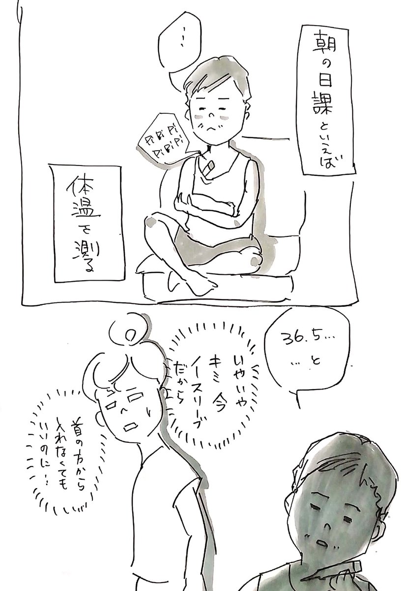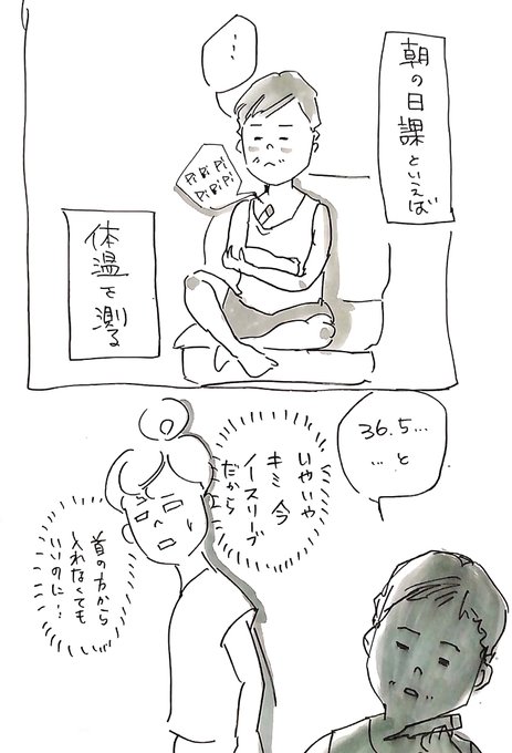 0 3 【朝の日課】 体温計測が日課となった朝の光景 パンツ&ノースリーブの肌着で寝る息子に 何度ツッコんでも治らない これも日課 #朝の日課 #体温計測 #漫画 #絵日記 #イラスト #アナログ絵 #ペン画 22/09/06 15:14