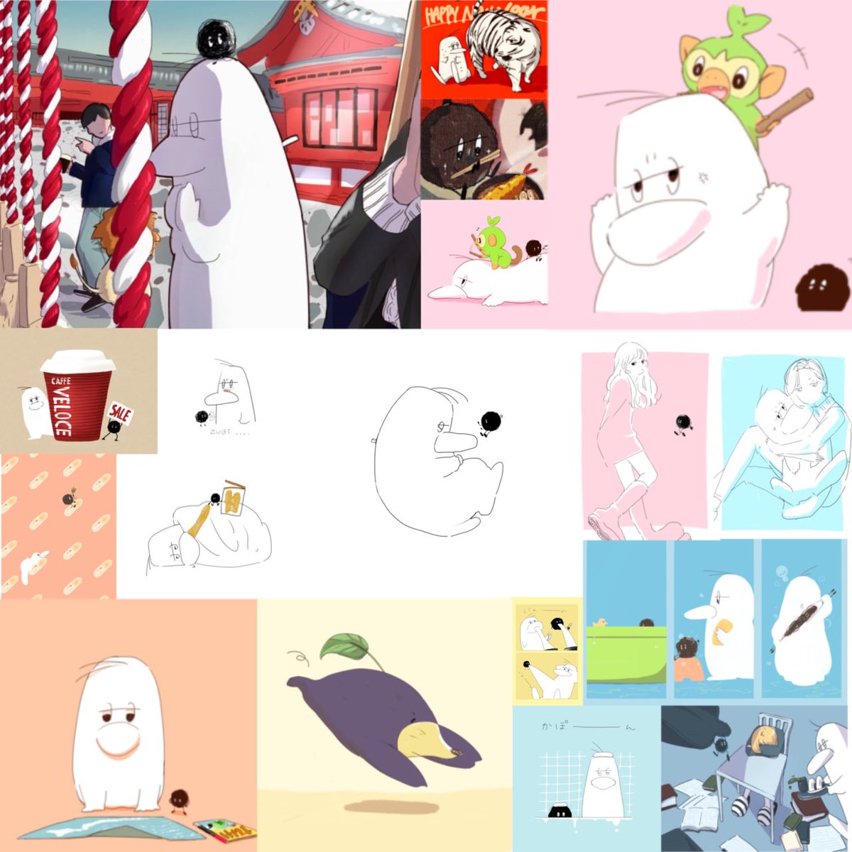 #今月描いた絵を晒そう コラージュにしてみました。全部は入りきらなかった…笑 毎日投稿1ヶ月目でようやく、絵柄と方向性が安定してきました。多分。 2月もちょっとシュールでかわいい(?)絵を目指して沢山描きます🐶