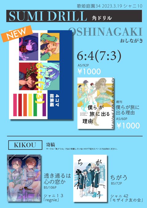 50 96 3月19日の都立産業貿易センター浜松町館にて開催される #歌姫庭園34 シャニ10 𝑆𝑈𝑀𝐼 𝐷𝑅𝐼𝐿𝐿 の 𝑂𝑆𝐻𝐼𝑁𝐴𝐺𝐴𝐾𝐼 です。 寄稿した合同誌が同イベントで出ているそうなのでそちらもよろしくお願いします。 23/03/16 21:01