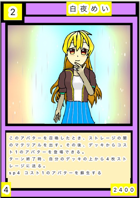 0 3 バーチャルストラテジー 白夜めい 召喚時、ストレージからマテリアルを出して、デッキからコスト1のアバターを出せる。 めいだけで蘇生と登場を使える便利なアバター。 #イラスト #自作カード 22/09/08 08:56