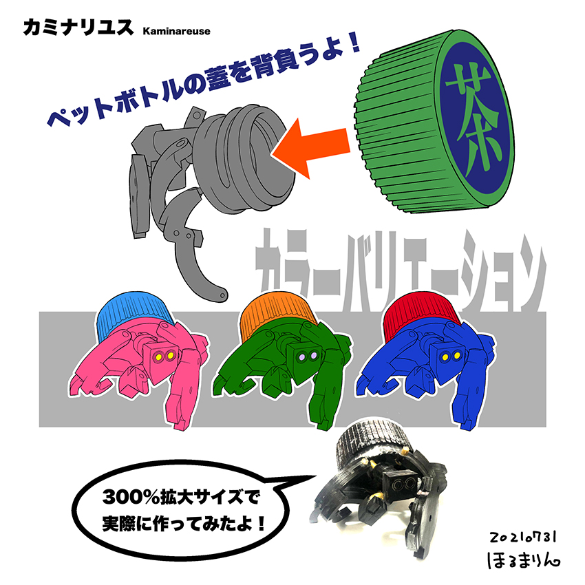 #発掘大作戦2021応募 カミナリユス ヤドカリの古い呼び名カミナと再利用のリユースでカミナリユス。 ペットボトルの蓋でお着替え遊びができるよ。 利口なメカではないよ。 ただトコトコ歩きまわるだけだよ。 それだけで充分かわいいよ。