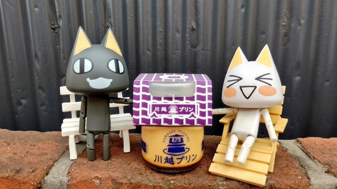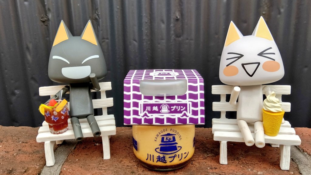 プリン🍮屋さんが気になったのでさっそく購入ニャ! おいものプリンみャ。お芋がごろごろでウマーなのみャ トロたちも休憩ニャー。冷たいソフトがおいしいニャ❤️ はー生き返るみャ~ #どこでもいっしょ #オモ写 #トロ #クロ #リボルテック #川越プリン