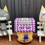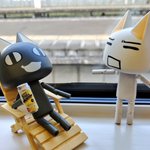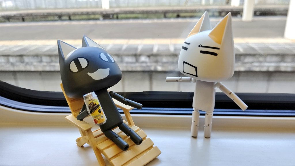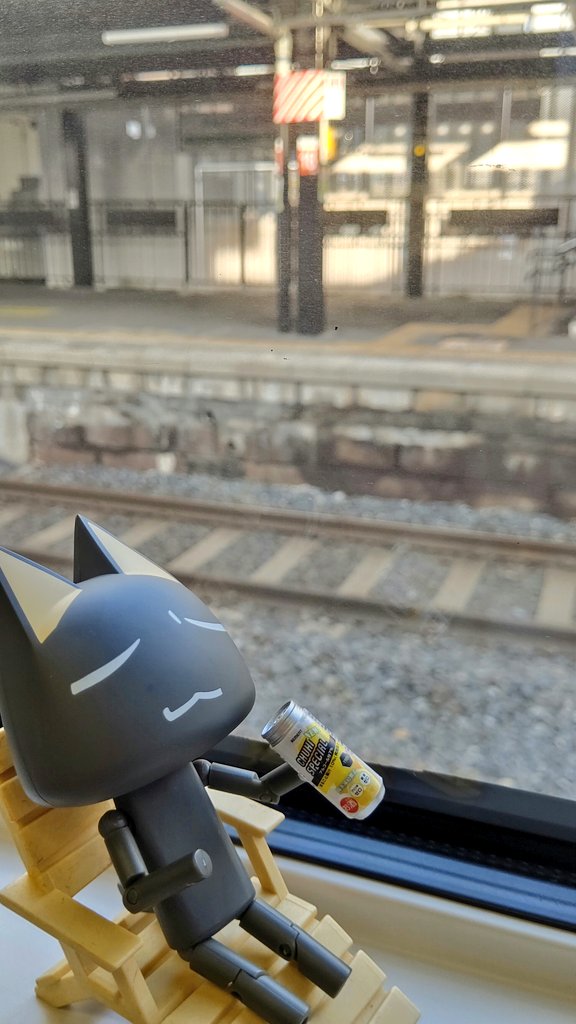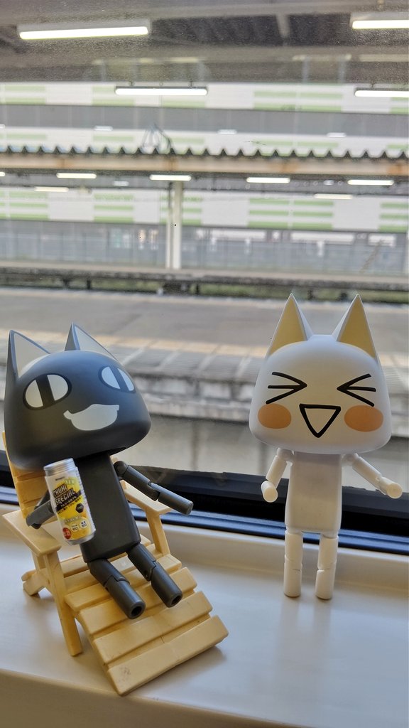 ニャニャ!駅に着いたニャ! 逸るなみャ、目的地はまだまだ先みャ~さて、おれっちはここで一息いれるみャ… って、もうチューハイ飲んでるニャ! #どこでもいっしょ #オモ写 #トロ #クロ #リボルテック