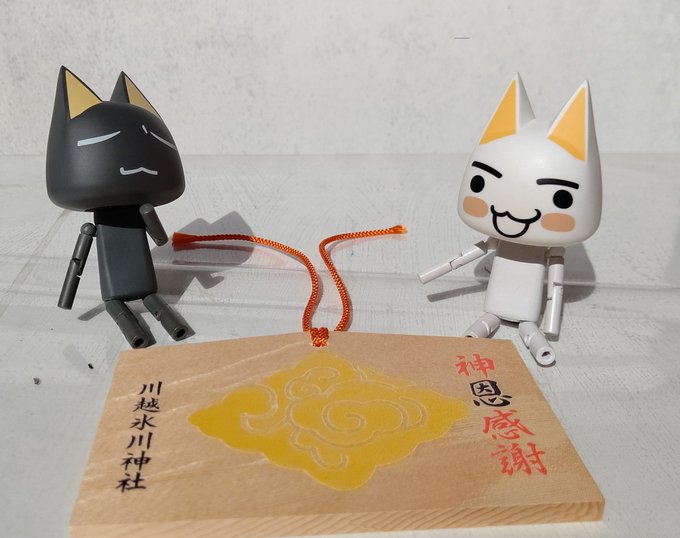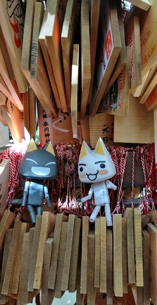 いっぱいお願いがあるのニャ こんなにいっぱいじゃ、神様もどれから叶えるか迷っちゃうだろうみャ! まぁ最後は自分の手で叶える心意気でいくのが良いんだけどみャ #どこでもいっしょ #オモ写 #トロ #クロ #リボルテック #川越氷川神社