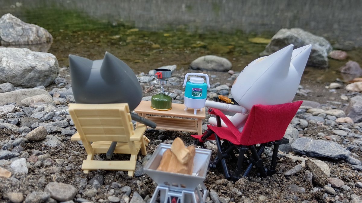川辺でキャンプするトロクロ 川キャン。涼しそう #どこでもいっしょ #オモ写 #トロ #クロ #リボルテック