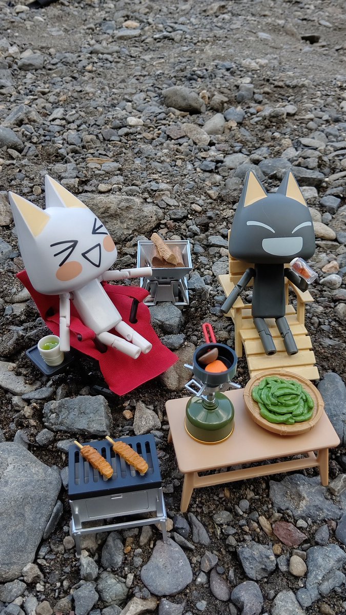 やっぱり外で飲むビール🍺はうまいみャ! も~クロってば、どんな時でもビールはうまいって言ってるのニャ! バレたか、みャッハッハッ #どこでもいっしょ #オモ写 #トロ #クロ #リボルテック #キャンプ