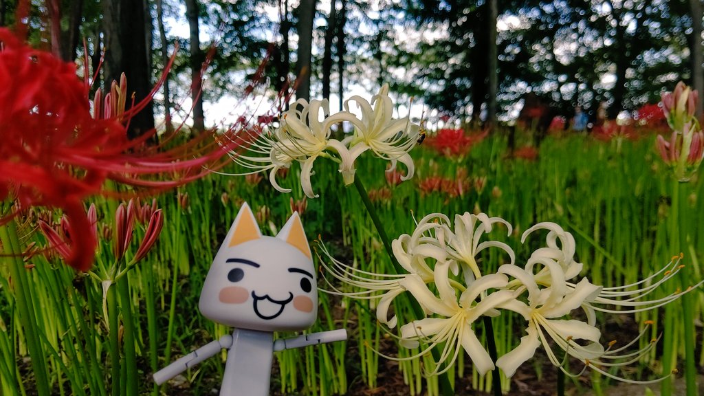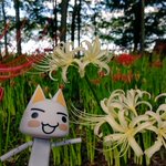 ね!ね!白い彼岸花ニャ!!珍しいの発見ニャ!回りにちょっとしか咲いてないからレアリティSSRなのニャ! #どこでもいっしょ #オモ写 #トロ #彼岸花 #リボルテック