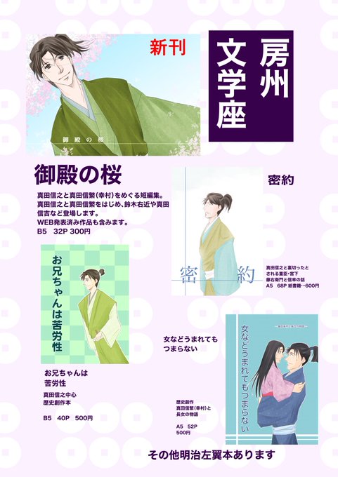 5/5 コミティア140 新刊のお知らせ&お品書き #真田信之 #真田信繁 #オリジナル #COMITIA140 pixiv.net/artworks/98080…