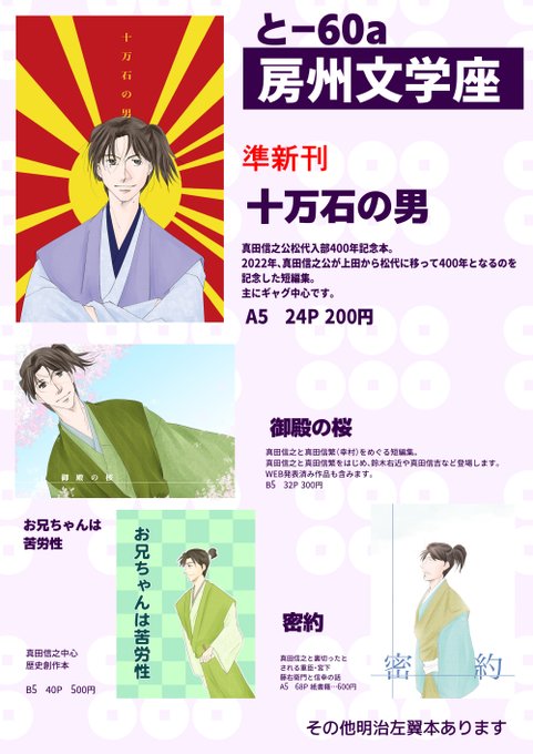 5/5コミティア と60-a 房州文学座のお品書きです。 すみませんが新刊ありません…。 無配ペーパーが新刊もどきです…。(無配なので後日ネットにUP予定です) 真田信之中心の歴史創作本を多数そろえておりますのでよろしくお願いします! #コミティア #歴史創作