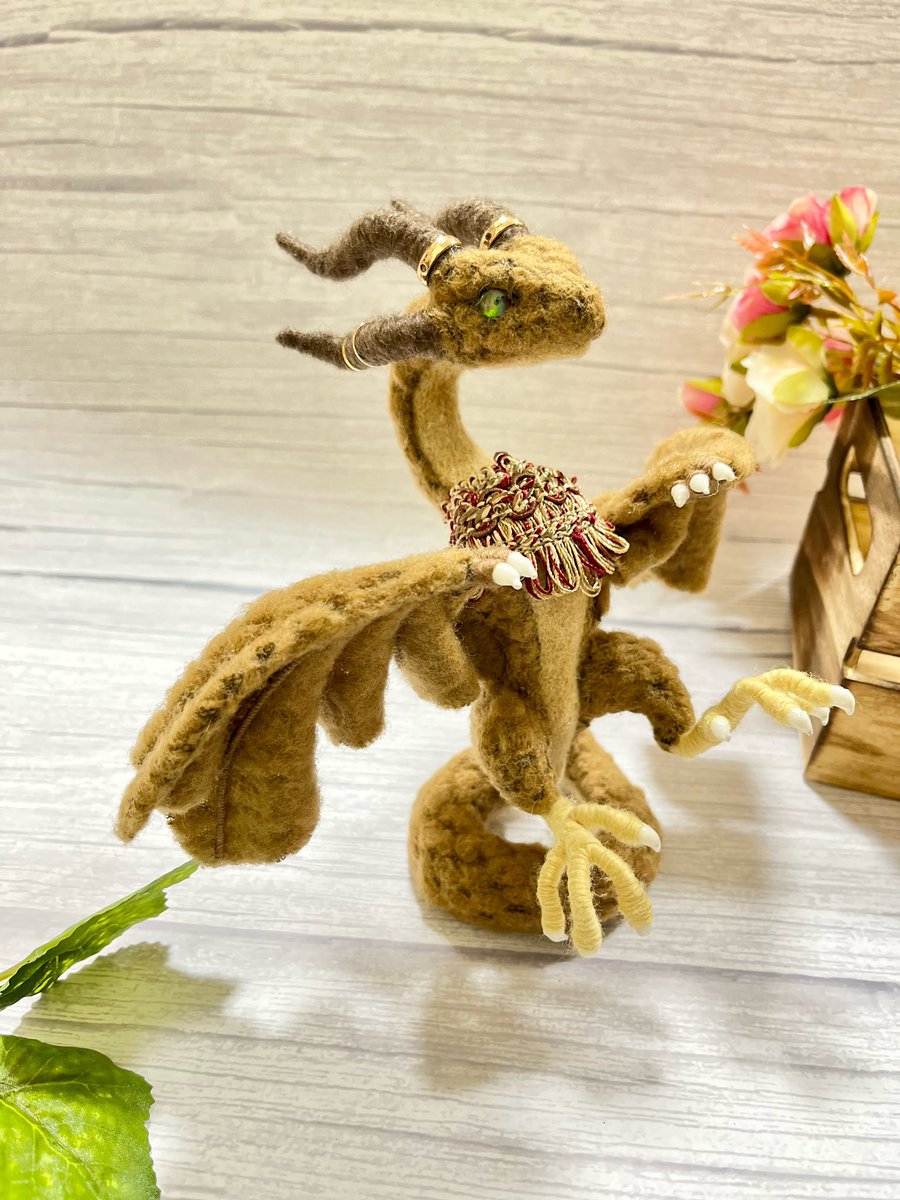 【おうち探し】 ワイバーンのおうち探しをさせて頂きます。 22,000円+着払い送料 尻尾で自立します。 翼はある程度開いたり閉じたりできます。 目は偏光グリーンで、見る角度によって色が変わります。 触り心地ふわふわです。 先着順、リプかDMにて。 #羊毛フェルト #ドラゴン #ワイバーン #竜