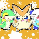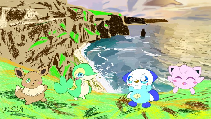 「美しいこの世界に僕達は笑顔で生きている」 #イラスト #ポケモン #ツタージャ #ミジュマル #プリン #イーブイ #ミジュマルファンクラブ