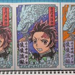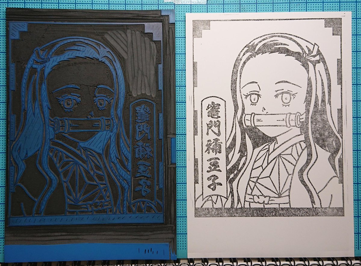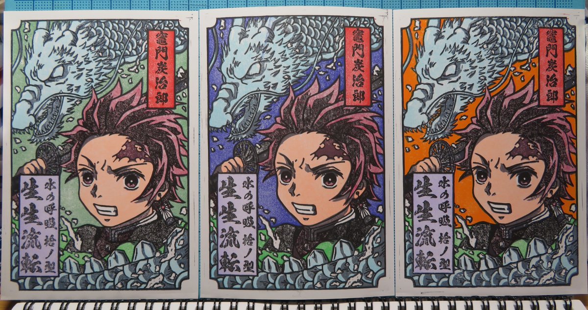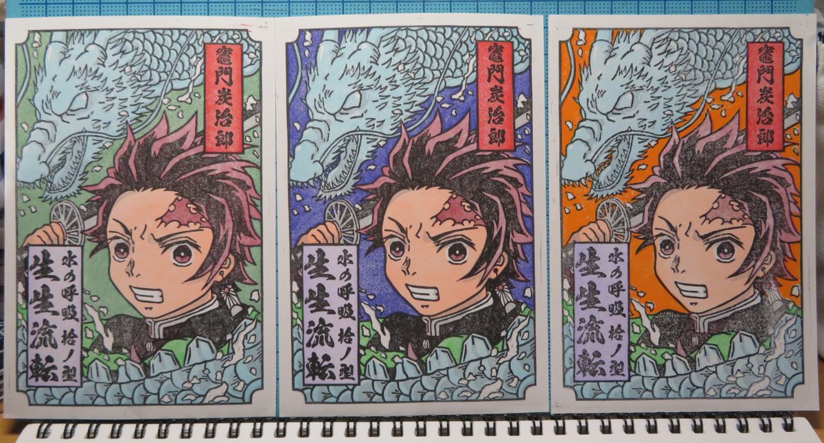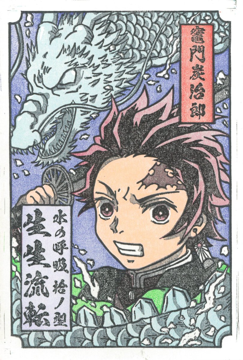 0 3 #ゴム版 9色8版+α 100×148 mm 改めて、 #鬼滅の刃 から #炭治郎 できあがりました。 手描き、手彫り、手摺りと大変でしたが達成感ありました。背景色と墨版(影)の濃さのバリエーションもよろしければ見てやってください。 残暑見舞いに使えるかな? #鬼滅の刃イラスト #版画 #絵はがき 20/08/07 22:07