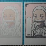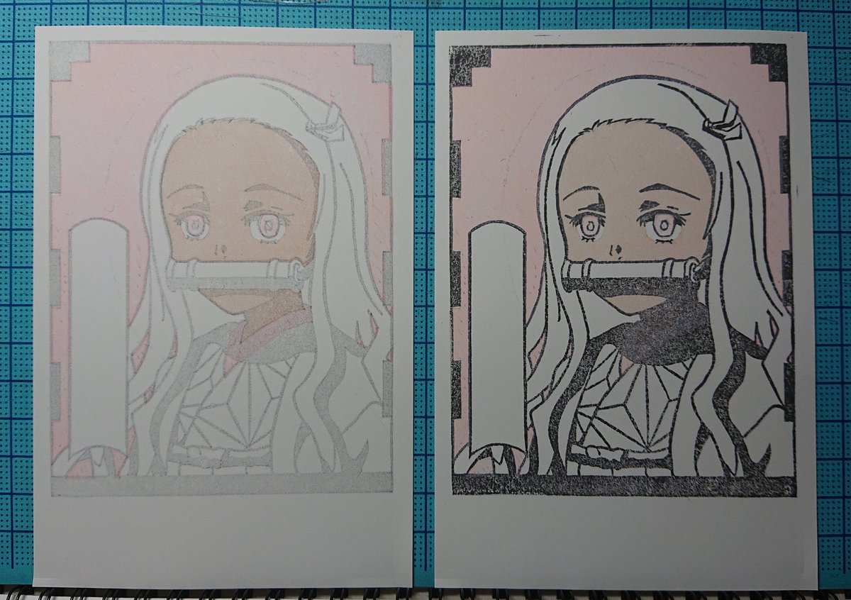 0 2 年賀状版画、9・10版目(11版予定) 茶:羽織 チャコール:髪の毛 いよいよあと一版です。このくらい色がついてくると、影が濃い方が立体感出ますね。 よゐこチャンネルの年賀状に出したいなぁ。 #鬼滅の刃 #鬼滅の刃イラスト #竈門禰豆子 #ゴム版 #年賀状 20/12/05 10:56