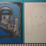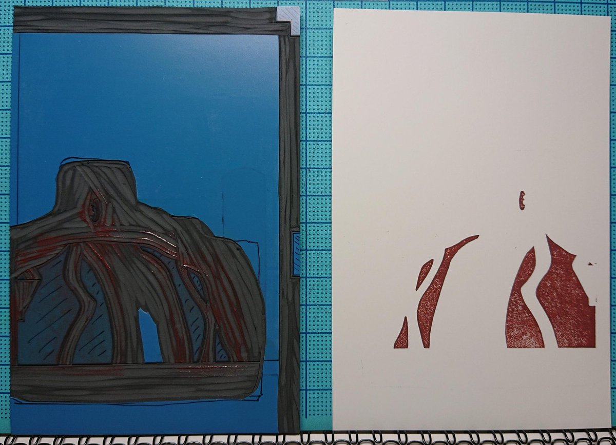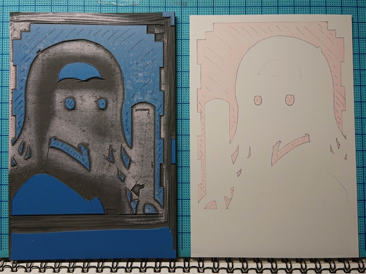 #このタグを見た人はラフ画とその完成絵を見せる 折角なので、色違いでこちらも便乗します。ヘロヘロのラフ描いて、トレーシングペーパーで少しずつ直して、ゴム版に写して彫って、摺ってます。