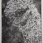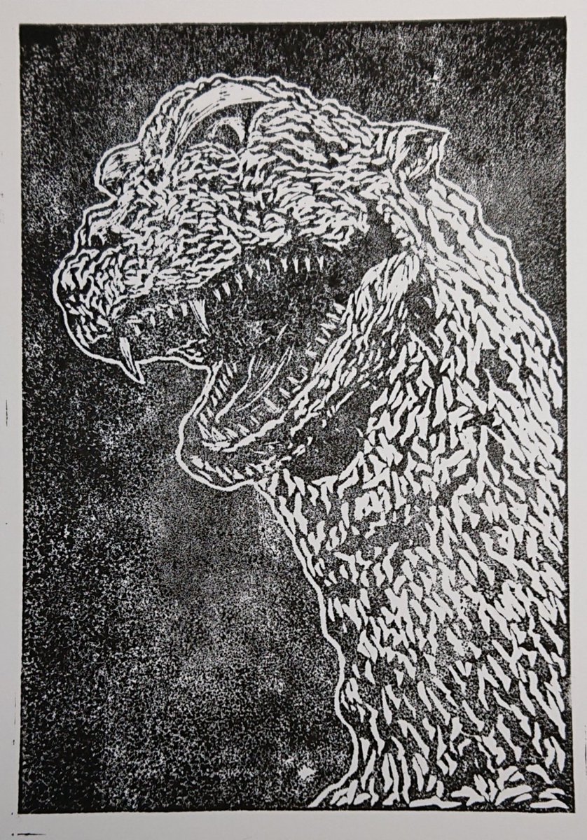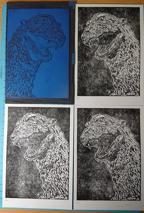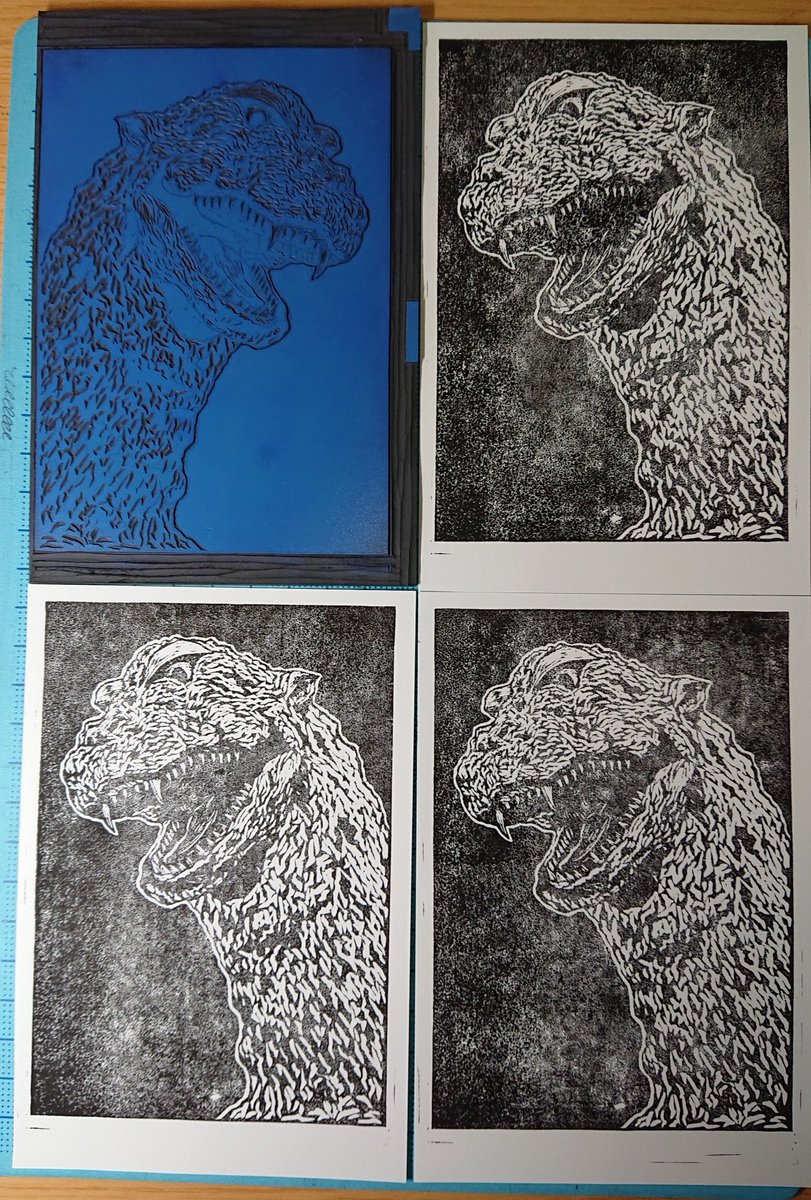 フォロワーさんが70人を越えました!いつも、いいねとRTありがとうございます!! 記念絵と言う訳でもないですが、初代ゴジラのゴム版を作って上げました。 浮世絵みたいな多版多色も好きですが、こういう単色でガシガシ彫るのも好きです。 どうぞこれからもよろしくお願いします。