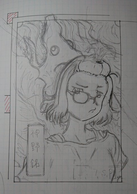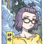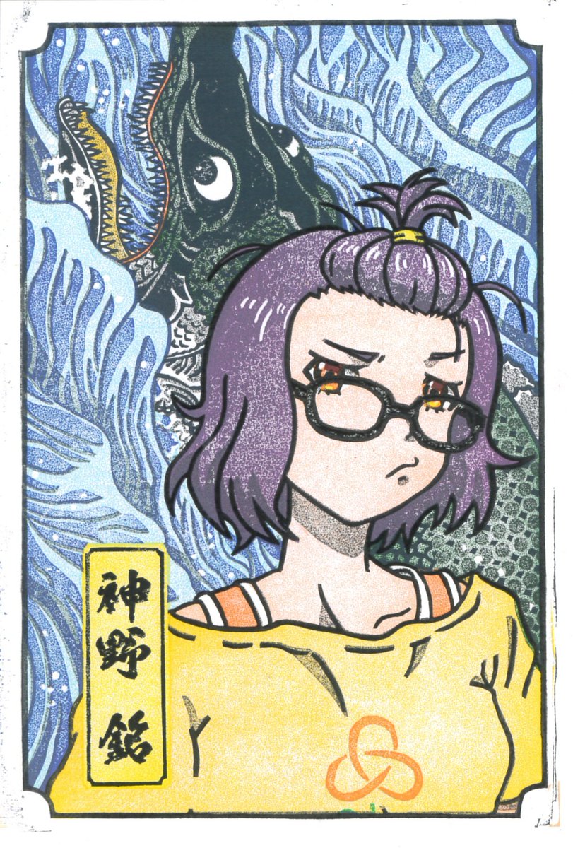 3 14 #このタグを見た人はラフ画とその完成絵を見せる 折角なので、色違いでこちらも便乗します。ヘロヘロのラフ描いて、トレーシングペーパーで少しずつ直して、ゴム版に写して彫って、摺ってます。 22/07/22 21:06