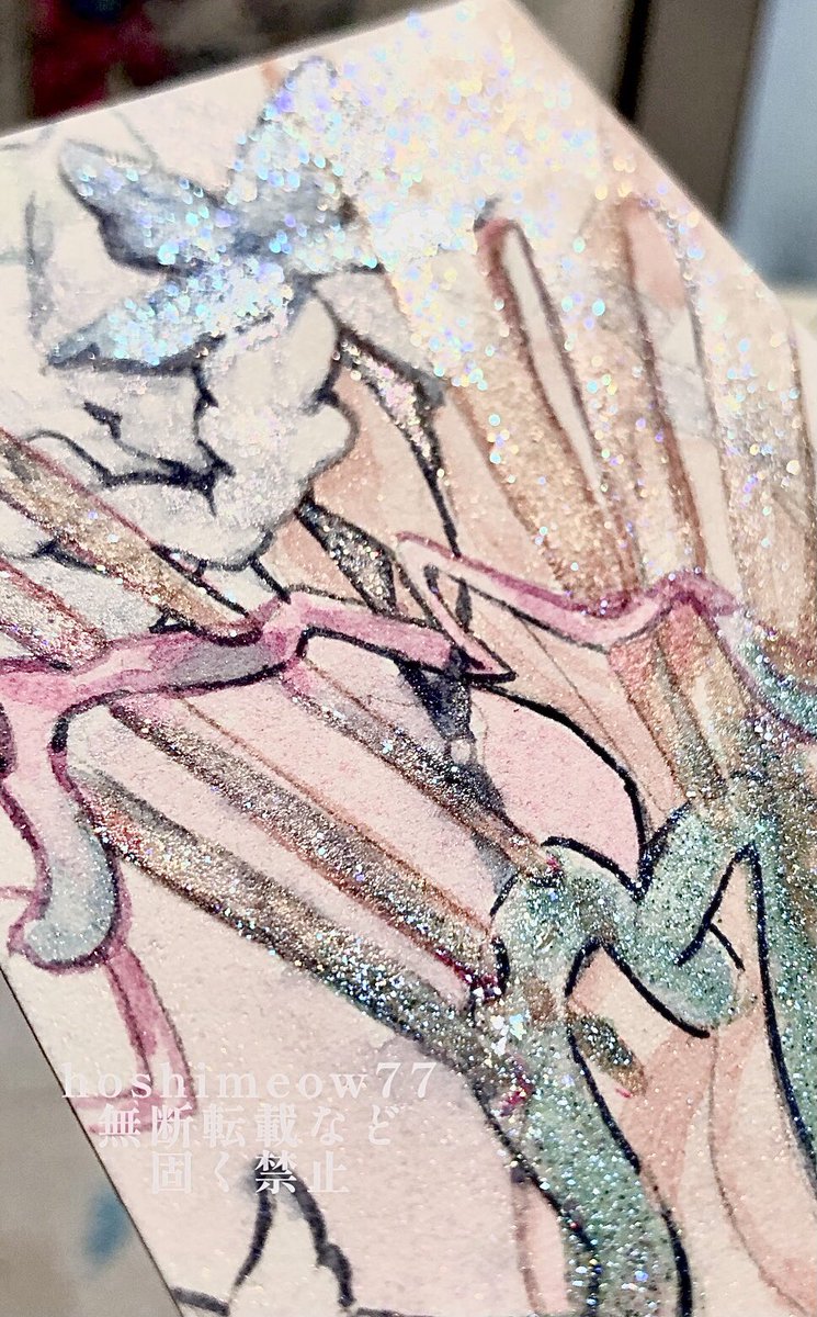 斜めに傾けた時のキラキラと髪の質感、すこです( > ·̫ <⸝⸝ᐢ )羽根としっぽ展にて展示させて頂いた作品です♡ #ほしさんはだぁれ #illustraion #イラスト #透明水彩