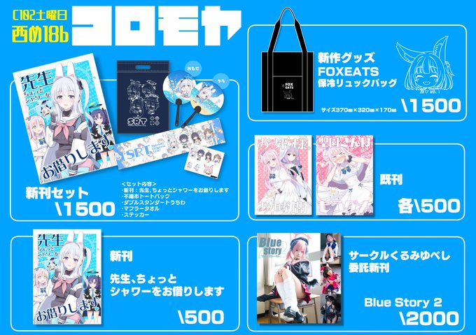 #C102 土曜西 “め” 18b コロモヤ おしながきです 100年ぶりにセット的なの作りました 謎のグッズ(FOXEATS)も作ったので少しだけ持っていきます 委託で売り子のクルミさん(@k_purarine)の写真集も頒布予定です よろしくお願いします🙏