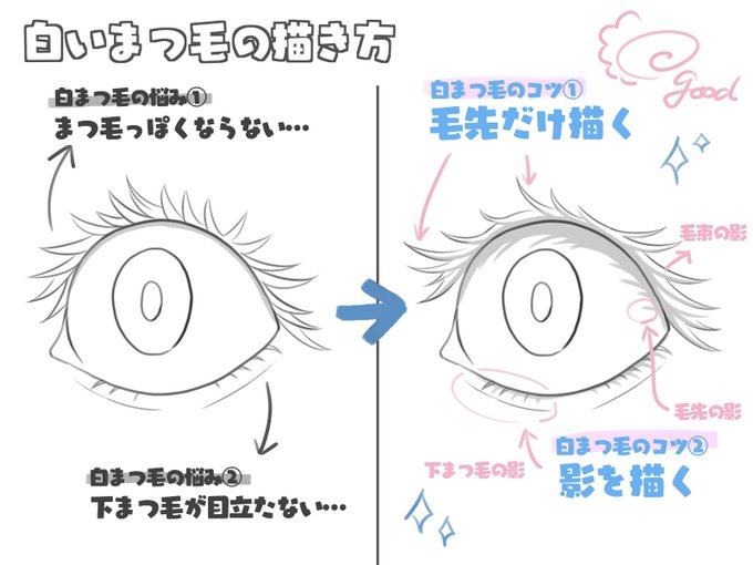 #イラストプチTips 🌟 白いまつ毛って、色がないから難しい!と思ったことあるかな? 色の薄いまつ毛は、 ✅線を控えめに ✅影を描いて輪郭を出す これらを意識してみよう! 一気に存在感が増して、豪華な目元になるよ!👀✨