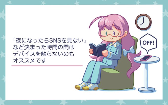 #イラストプチTips 🌟 『デジタルデトックスをしよう』 SNSを見るのがしんどくなったと思うことある? もしかしたら、情報で頭がいっぱいなのかも😵🗯 「デバイスに触れない/SNSを見ない」時間を作って頭をスッキリさせよう! つい開いてしまうSNSを1つ見ないようにするだけでもGood👍 (CYAN STAR)