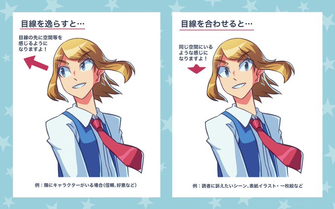 #イラストプチTips 🌟 『見ている人を見つめてみよう』 キャラの目線で印象は大きく変わるの👀 例えばこちらに目線を合わせれば同じ世界にいる感覚になるね🤝 「どこの」「誰に向けて」キャラクターが目線を合わせているのか意識してみよう💭 (スタッフ・CYANSTAR)