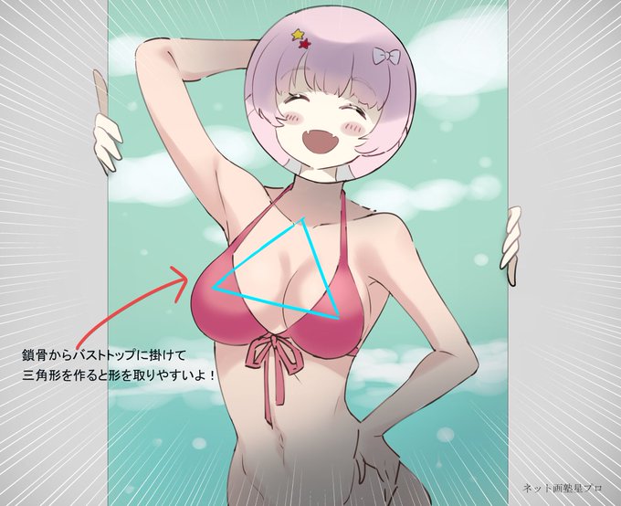 #イラストプチTips 🌟 『美しい胸のバランス』 女性を描く時、胸が綺麗に描けるととても魅力がUPするよね! ポイントは鎖骨の間とバストトップで三角の配置にすること!☝️ 絵にする時は、現実よりもリフトアップして描くと「垂れていない美しい胸元」に見えるよ!