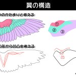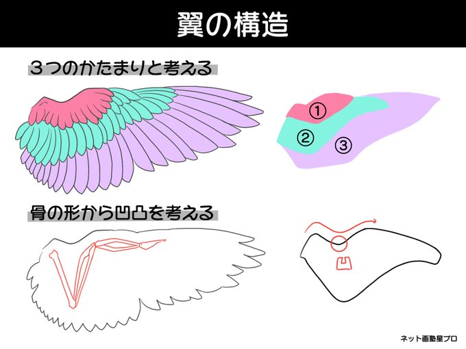 #イラストプチTips 🌟 『翼の構造』 天使が描きたい!羽ってどうなってるの?👼🏻 鳥の翼はざっくり3つのかたまりで捉えよう! ①小〜中雨覆 ②大+初列雨覆 ③風切羽 骨の形も要チェック! 羽の生え方や全体のシルエットを捉えるのに参考になるよ!