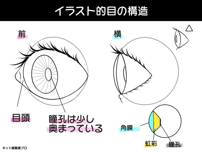 #イラストプチTips 🌟 『イラスト的な目の構造』 瞳を観察したことはあるかな?👁 ポイントは瞳孔の位置!☝️ 瞳孔は眼球の表面ではなくて、ちょっと凹んだ奥まったところにあるんだ。 横から見た時は虹彩と角膜の間に空間(前眼房)が見えるよ!👀 観察してみよう!