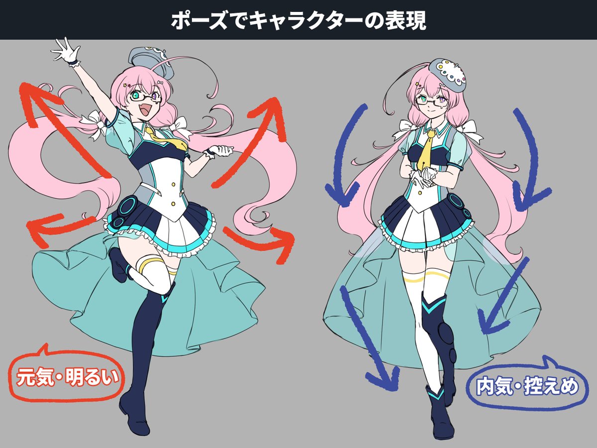 #イラストプチTips🌟 『性格をポーズで描き分けよう!』 キャラクターのポーズが決まらない……そんなときは このキャラクターはどんな性格かな?と考えてみよう! 外向的な子は「外向き」、内向的な子は「内向き」を意識するといいよ! (楠木なっく @kusunoki_nack)
