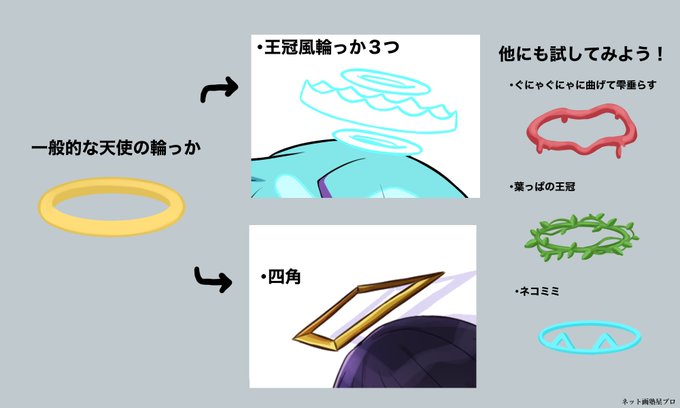 #イラストプチTips 🌟 『天使の輪っか』 天使の輪っかって円形のイメージがあるよね。 でもいろいろ形を変えてみたり、素材を変えたりしたらオリジナリティが高まるかも! (世良セラ@ sera_sefi6 )