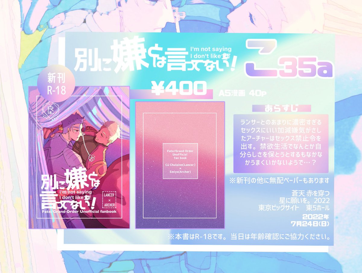 【サークル参加します!!】07月24日(東京)星に願いを。2022 -day2-内 蒼天 赤を穿つ 星に願いを。2022| #イベントGO_赤ブー akaboo.jp/event/item/201… ということで! サクカは過去絵の使い回しです🥹久しぶりの参加なのでケツに火をつけて頑張ります❗️🔥