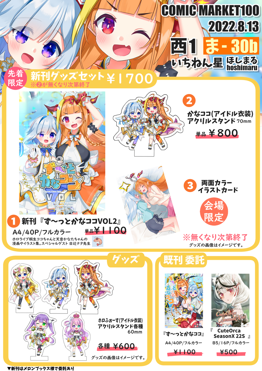 #C100 のお品書きになります!新刊はず~っとかなココ第二弾のVOL2!そして、また在庫僅少でホロふぉーすのアクリルスタンドを準備してみました!是非、当日お越しの方はお立ち寄りくださいませ! スペース▼1日目西1ま-30b WEBカタログ▼webcatalog-free.circle.ms/Circle/16209212 通販▼melonbooks.co.jp/detail/detail.…