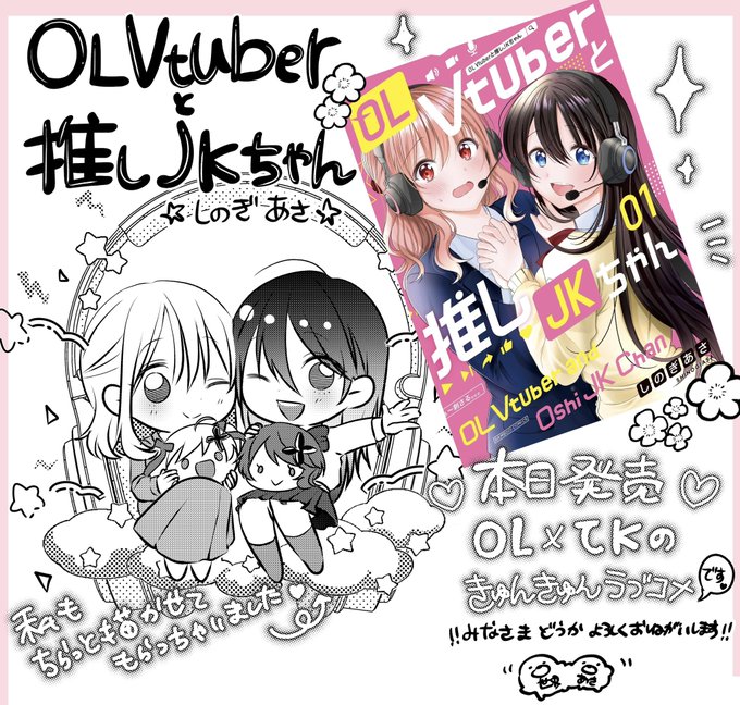 本日双子の妹♡しのぎあさ先生(@kiratiwawa777)の百合漫画 OLVTuberと推しJKちゃんの発売日です!❤️1週間の売り上げ次第で続刊が出るかもしれないので百合好きの皆様どうか宜しくお願い致します🥹💓🙏(私もFA描かせてもらいました😚しかもあとがきにもこのイラスト使ってくれた↓💕コソッ)