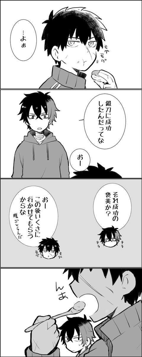 111 343 【同田貫と肥前くん】(自本丸小話) 肥前くんにも頑張って鍛刀してもらってるけど、なかなか成功できない模様。 22/09/04 00:16