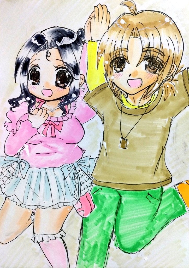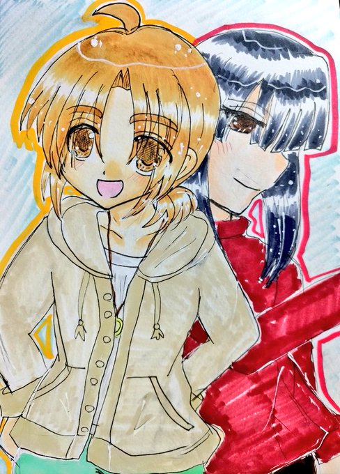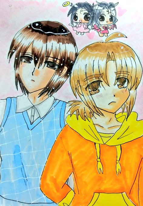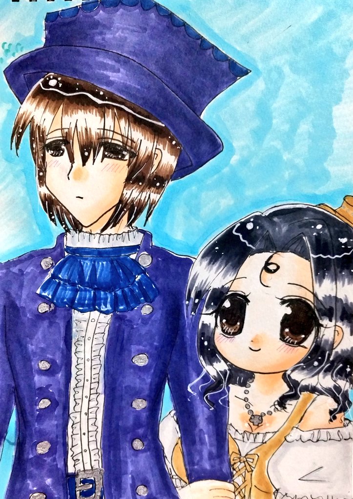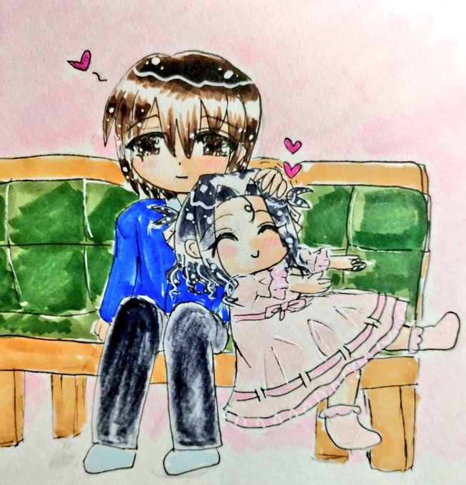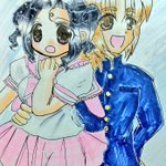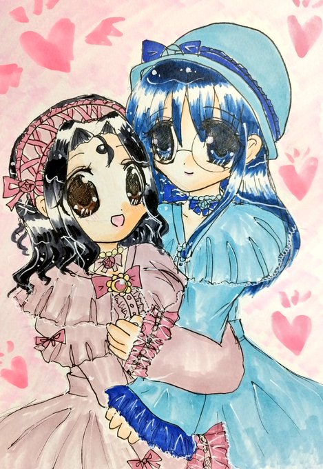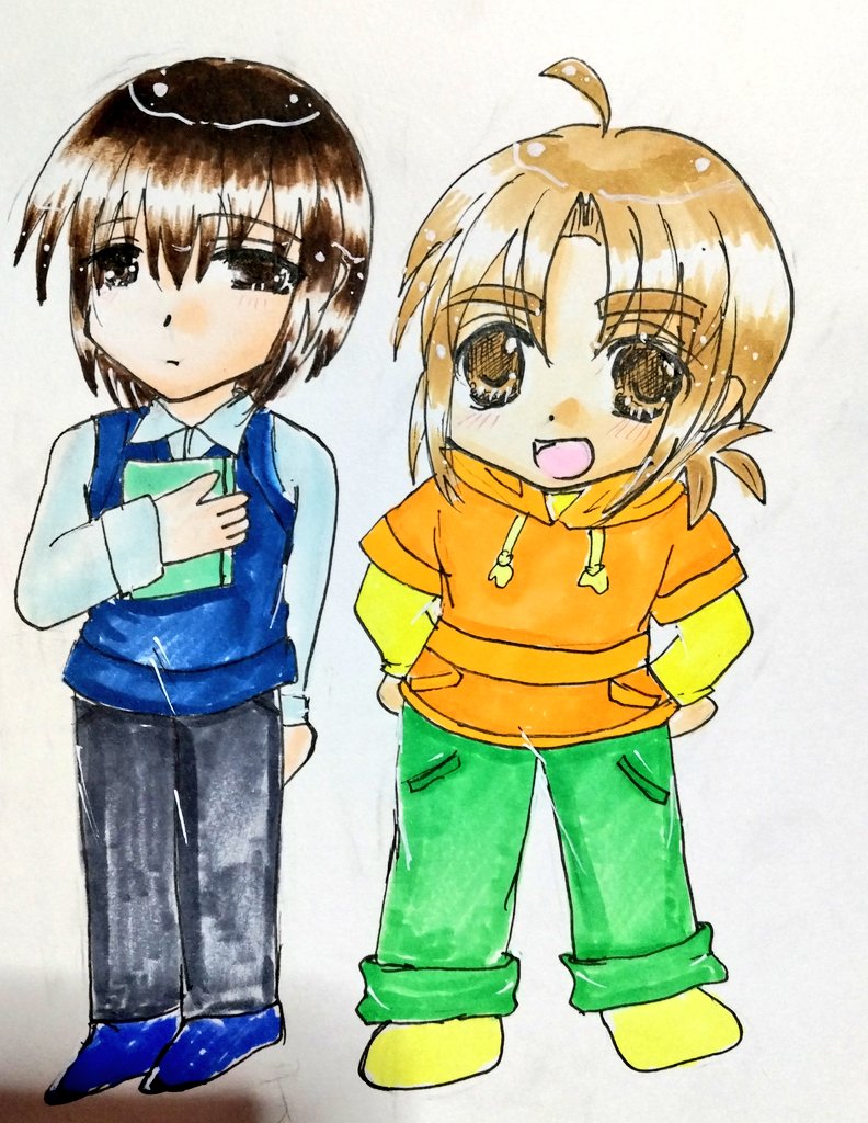 #今月描いた絵を晒そう こちらはよそのこ。お誕生日向けに描かせていただきました(*´ω`*) 介那さんのところの翡翠ちゃんと、真義さんのところのやつめのこちゃんです( ꈍᴗꈍ) ぷにぷにで描くのが好きです( ´;゚;∀;゚;) 逆に面長は苦手です(;_;)(うちのこだと俊騎、霧夜)