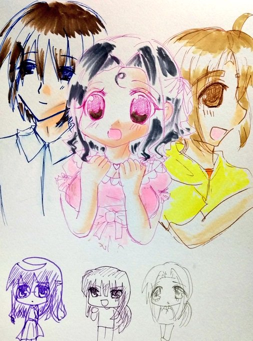 #今月描いた絵を晒そう その3 他のものより楽に描いたもの。 コピックマルチライナー載黒以外を色々使ってみたもの。 新川家。 3人のママたちの若い頃。 パラレルワールドの俊騎君の、弟新川真樹君。俺っ子ショタ。