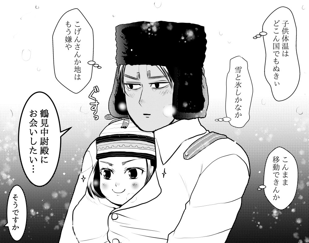 #ゴールデンカムイ版深夜の真剣お絵描き60分一本勝負 ( @hupuchabaaaaa) 【お題】冬・雪・氷 (本誌可) エノちゃんと鯉くん シャプカ描きたかったのでかぶってもらいました