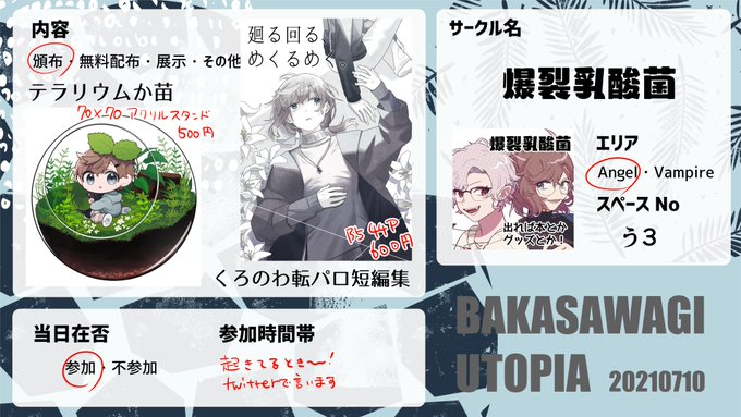 147 1034 #ばか騒ぎユートピア 1週間後~~!こちらのイベントにて本とアクスタ頒布させていただきます!本のサンプルはリプツリーにて💪😌マジ不慣れですがよろしくお願いします 21/07/03 15:15