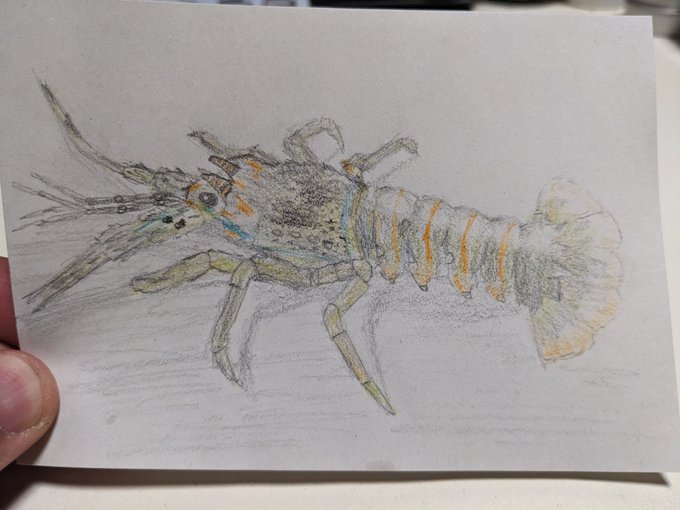 #もこ田ワンドロ展覧会 色鉛筆でニシキエビ描いてました。ひさしぶりのお絵描き、めめめと一緒にできて楽しかった!🦐