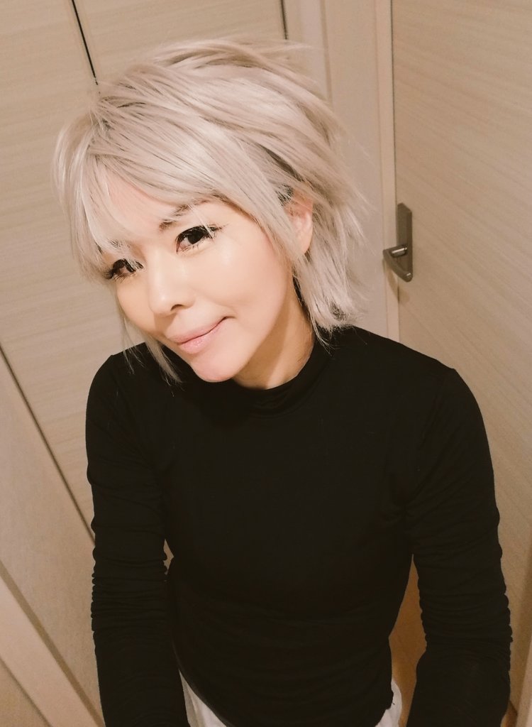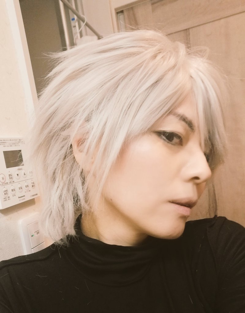 3 19 息子に被せるためのズラをママが被ってセルフカットして調整。一応ヒュンケルさん予定だけどなんか違う。 #宅コス 22/12/07 21:58
