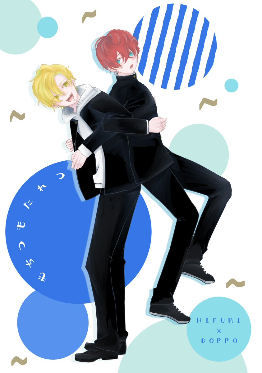 5 13 【6/25 ひふどオンリー】新刊サンプル(1/2) 「もちつもたれつ」A5/26P/300円(会場価格) 性格も考え方も正反対の2人がケンカしたり仲直りしたりする本 表紙に合わせて本文も薄い水色の用紙の予定です🥳 23/06/19 21:34