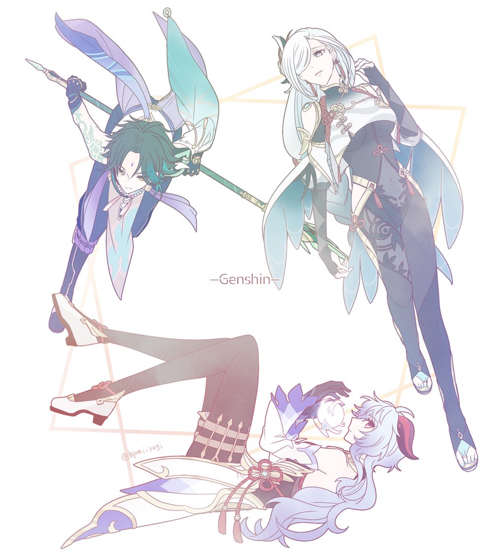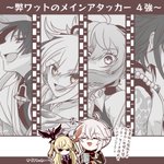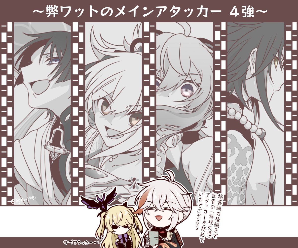 (※別ジャンルお絵描き) 今年の海灯祭の魈蛍ちゃんがどえりゃあ可愛くて描かずにはいられなかった(ネタバレ注意)。 この二人は小動物同士のじゃれあいを見てる感覚で癒される…🐥🐣 2枚目はうちのメインアタッカーズの落書きと、先日描いた推し3人のイラストも一つにまとめたかったので再掲失礼!