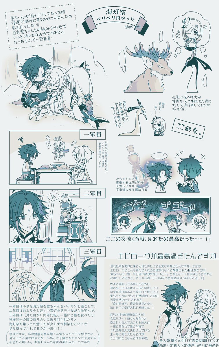 67 383 (※別ジャンルお絵描き) 今年の海灯祭の魈蛍ちゃんがどえりゃあ可愛くて描かずにはいられなかった(ネタバレ注意)。 この二人は小動物同士のじゃれあいを見てる感覚で癒される…🐥🐣 2枚目はうちのメインアタッカーズの落書きと、先日描いた推し3人のイラストも一つにまとめたかったので再掲失礼! 23/02/09 05:00