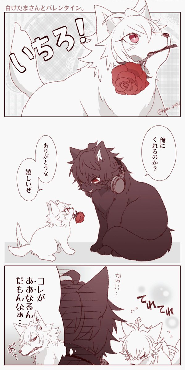 (※動物概念落書きサマイチ) 1日遅れな上に当初の予定からだいぶ脱線したバレンタイン小ネタ。 白けだまは未来の番へのアプローチを欠かしません🌹