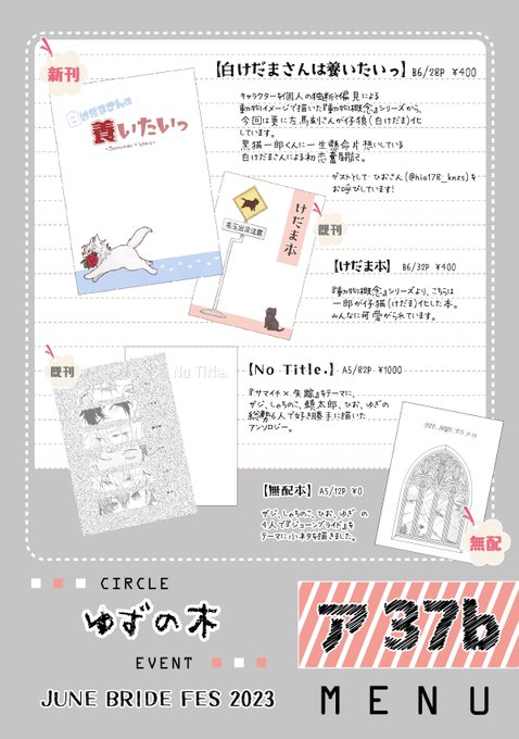こちら明日のお品書きですー! ザジさん(@nogutama34)、しゃちさん(@m_shachi)、ひおさん(@hio178_knzs)、ゆぎ で『ジューンブライド』をテーマした漫画をそれぞれで描いた合同無配小冊子も頒布予定なので、是非お立ち寄りいただけると嬉しいです💐