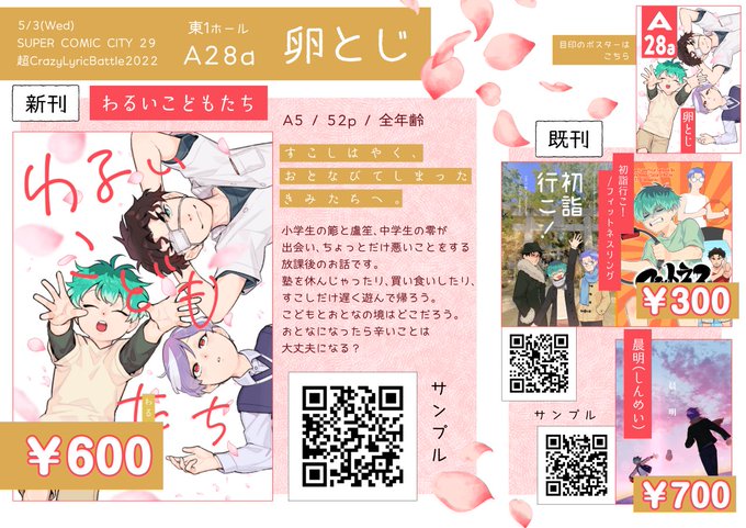 【お品書き】 5/3 超CrazyLyricBattle2022 東1ホール A28a サークル「卵とじ」 <頒布物> 新刊「わるいこどもたち」 サンプル【twitter.com/hq1999/status/…】 既刊「初詣行こ!/フィットネスリング」 サンプル【pixiv.net/artworks/95669…】 既刊「晨明」 サンプル【pixiv.net/artworks/95378…】