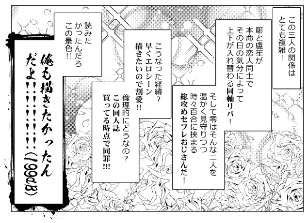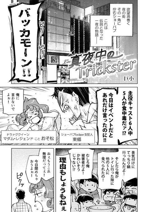 東おそ派生アンソロに寄稿したまんがです。 主催のAZさんから再録・掲載許可いただきました! 『派生』をテーマにしたアンソロジーだったので「ドラァグクイーンの東郷さん×ドラァグクイーンのおそまつ」を描きました、楽しかったです💋(1/3) #東おそ派生アンソロジーTHELOVE
